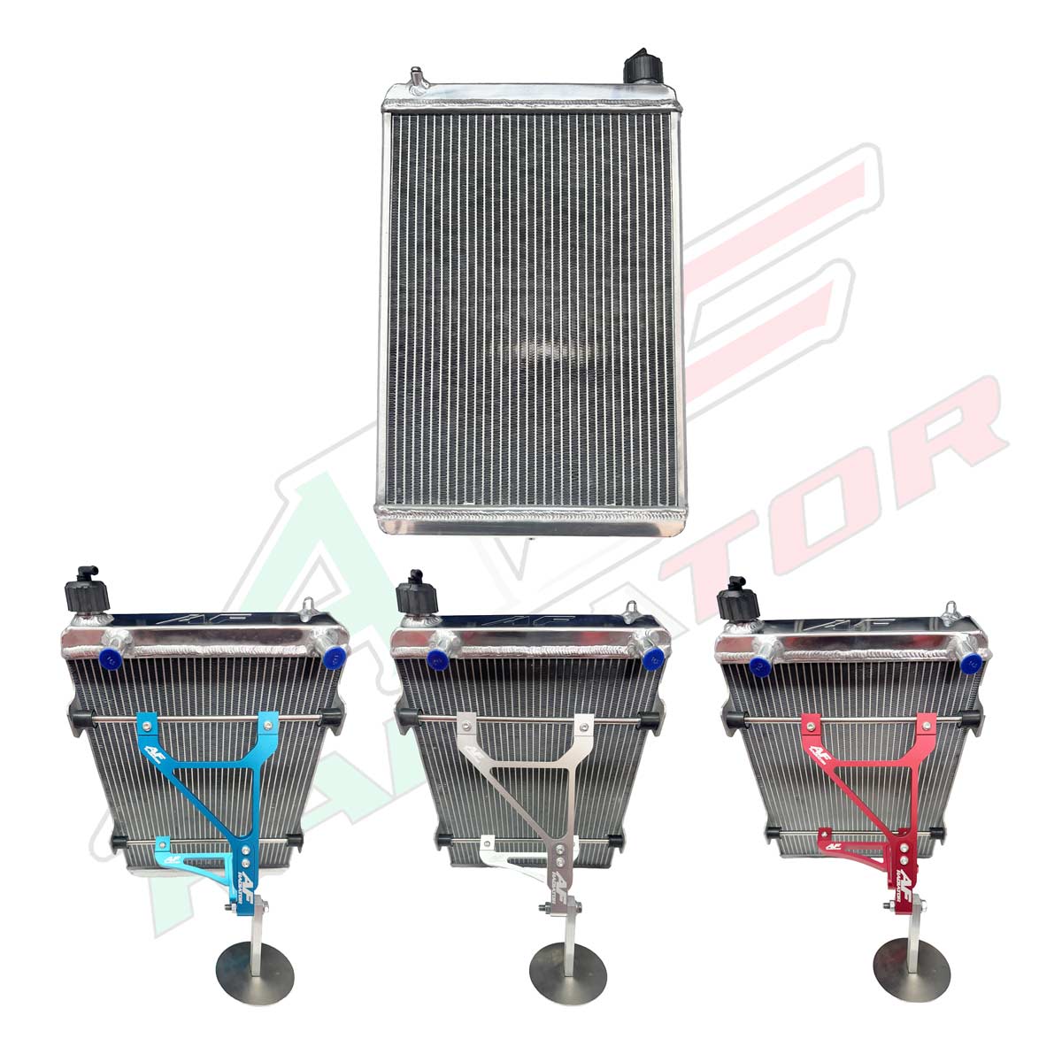 Der H2 Big Kühler wird mit Kunststoffkappe und CNC-gefrästen Aluminiumhalterungen in den Farben ROT, BLAU und SILBER geliefert.